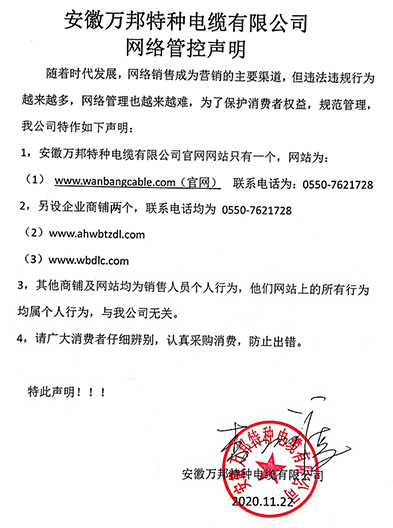 鄭重聲明:安徽萬邦特種電纜有限公司官方網站為:www_wanbangcable_com.cqfans.cn,除此之外無任何子網站或合作網站,其余均為假冒偽劣。電話:0550-7621728 13485756353 地 址:安徽省天長市滁州高新技術產業開發區經四路29號
